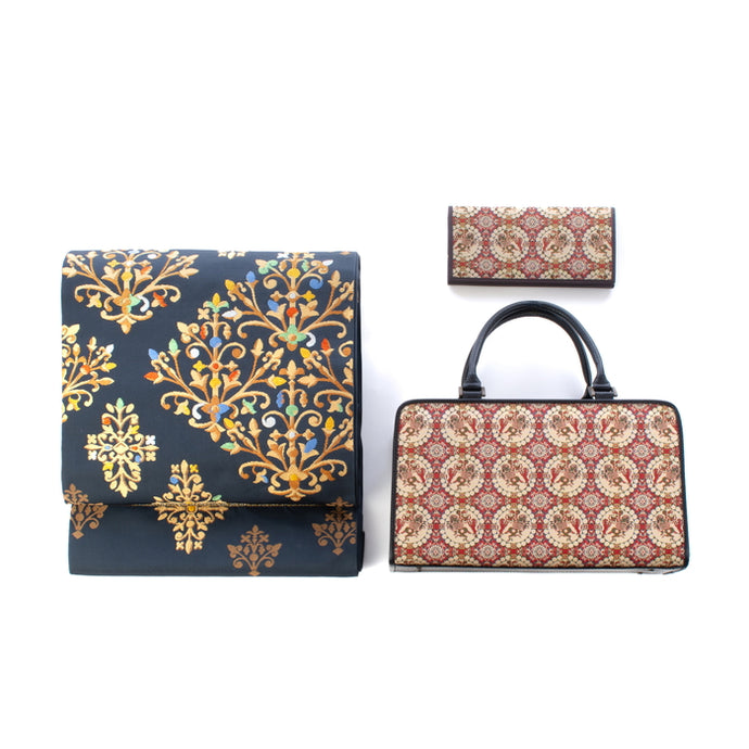法隆寺に伝わる国宝「獅子狩文様錦」は「四天王紋旗錦」とも呼ばれています。ササン朝ペルシャの典型的文様構成である、連璧円文内に中央の花樹を境とした左右対称の構図をもち、ペルシャ風の四人の騎士が有翼の駿馬を御し、飛びかゝる獅子を射ようとする活動的な文様で、いわゆる狩猟文様と称される図形です。本品は、その獅子狩文様錦の変形で、花樹を除き、ペルシャ騎士を一人にし、獅子を一頭にして、円文の四隅には華麗な華文を配し、新しい構図により経錦の織法で織り出したものであります。