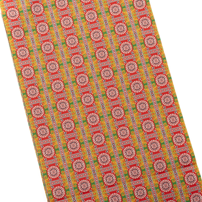 The design is composed of a lotus flower pattern in the center surrounded by a pearl roundel inside a square. Being richly colored, this textile has an exquisite charm of "Shokko".