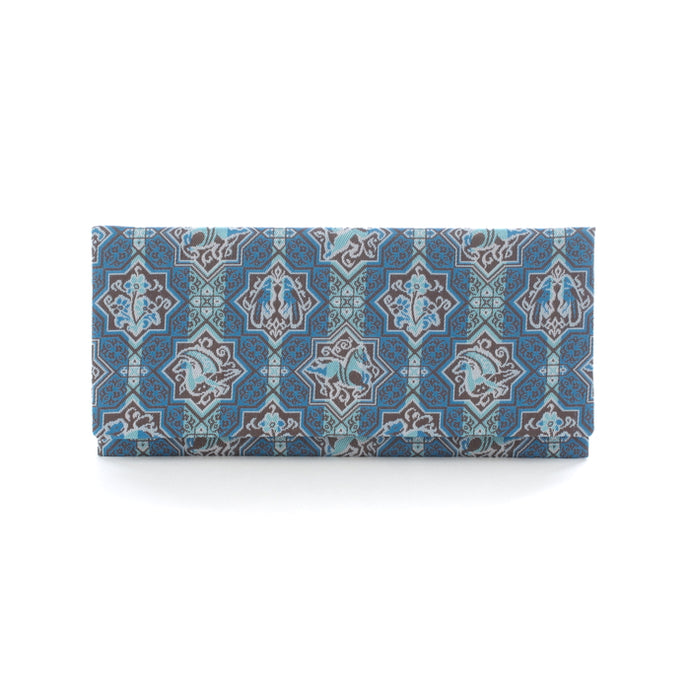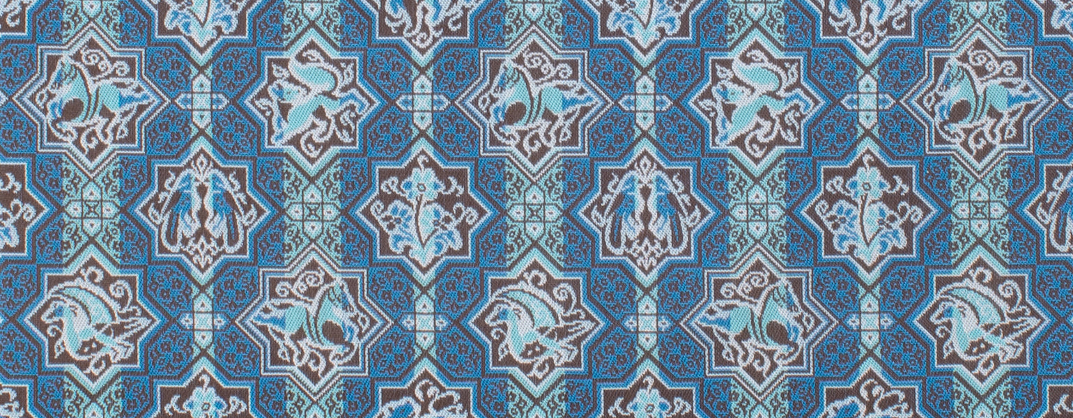 We wove, into a warp-patterned brocade, hte small world of the animals spread endlessly in the stars of the tiles, trying best use of the original colors of the Seljuk tiles such as sacred blue, charming white, and black.