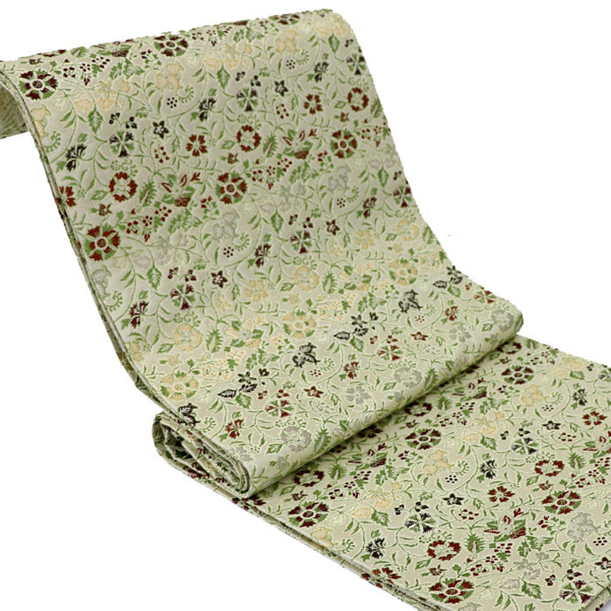 The design of this brocade is originated from a cloth which covered a writing desk and an inkstone case, preserved at Soun-ji Temple in Hakone, Kanagawa Prefecture, belonged to Sogi (1421-1502), the master of the "linked verse" type of poetry called renga, and is now designated as an Important Cultural Property. The original is a silver brocade with a ground filled with silvered paper stripes and patterned with a bine arabesque design of wild pink in colored yarns of green, maroon, and slight rouge.