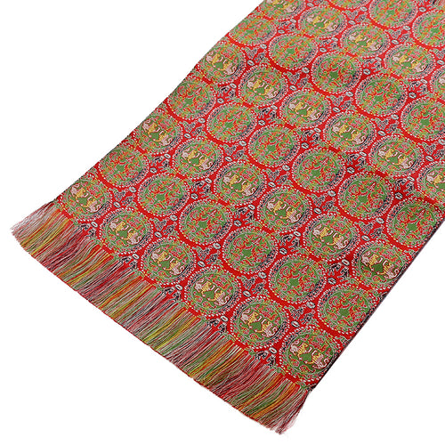 This is a warp-patterned brocade with design of a pair of Chine se white tigers and phoenix, the imaginary animals to protect the west direction and the southern direction respectively according to the ancient Chinese thought, appear in roundel of the Sassanian Dynasty of Persian style. The original design has been handed down in Horyu-ji tem ple in Nara, Japan since the 7 th century. The arabesque pattern in the roude l are also the typical of that period.