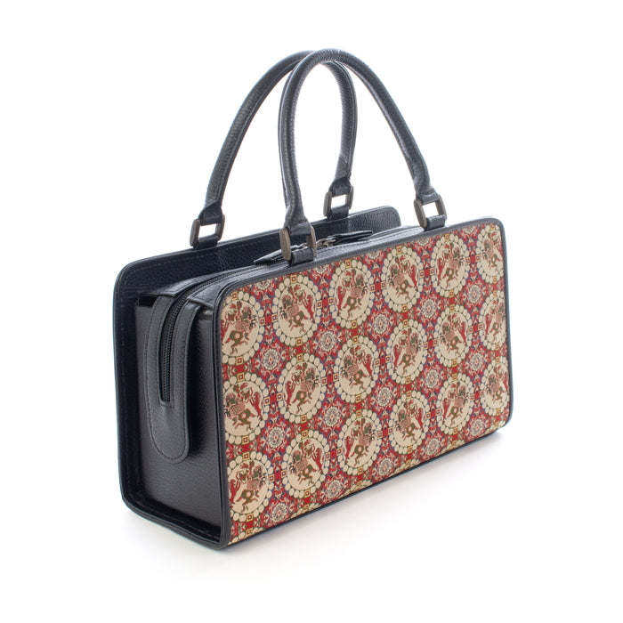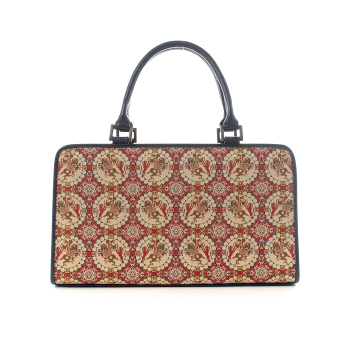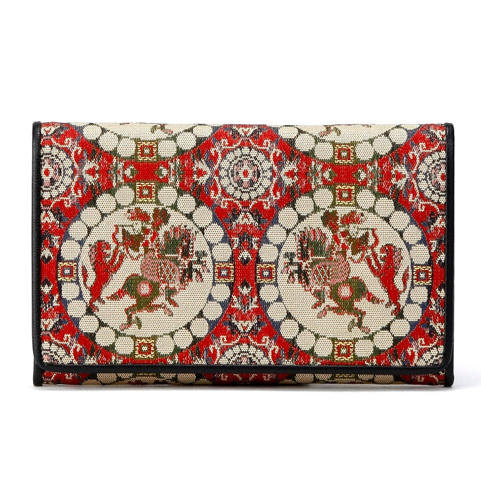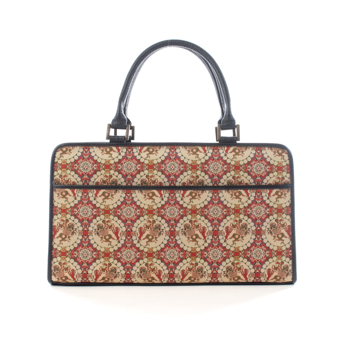This is a modified design from a brocade of the "Beaded Medallions Enclosing Four Mounted Lion Hunters", designated as the National Treasure, preserved in Horyu-ji temple in Nara, Japan since the 7th century. The original design consists of two pairs of kings mounting on horsebacks and shooting lions which are symmetrically placed on each side of a flowering tree in a pearl roundel that is the characteristic of Sassanian Dynasty of Persia.