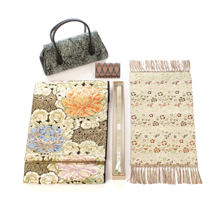 The design of this brocade was modeled on melon skin which can never be thought by people’s sensibility, and the design was woven into the tasteful brocade with our refined weaving technique.