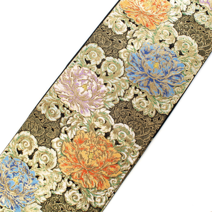 The design of this brocade is originated from a cloth which covered a writing desk and an inkstone case, preserved at Soun-ji Temple in Hakone, Kanagawa Prefecture, belonged to Sogi (1421-1502), the master of the "linked verse" type of poetry called renga, and is now designated as an Important Cultural Property. The original is a silver brocade with a ground filled with silvered paper stripes and patterned with a bine arabesque design of wild pink in colored yarns of green, maroon, and slight rouge.