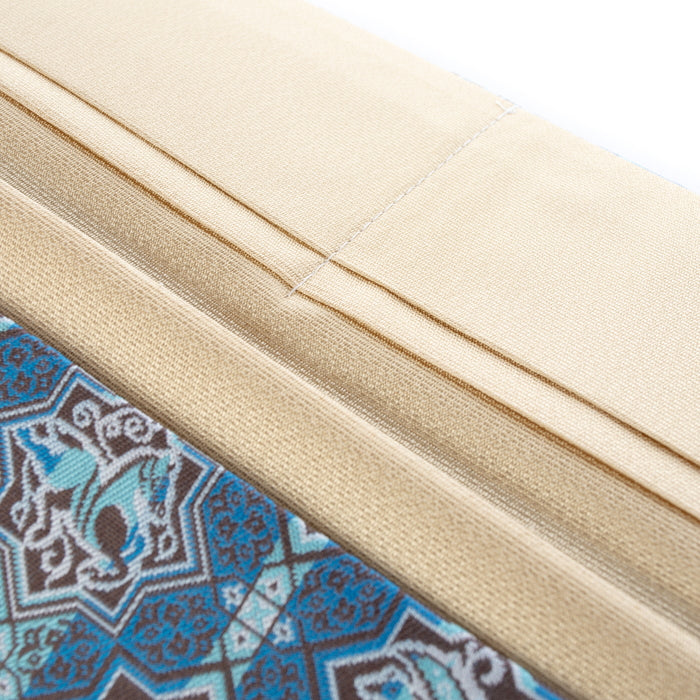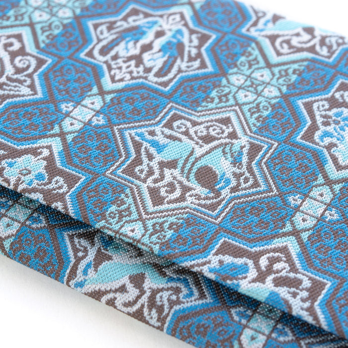 We wove, into a warp-patterned brocade, hte small world of the animals spread endlessly in the stars of the tiles, trying best use of the original colors of the Seljuk tiles such as sacred blue, charming white, and black.