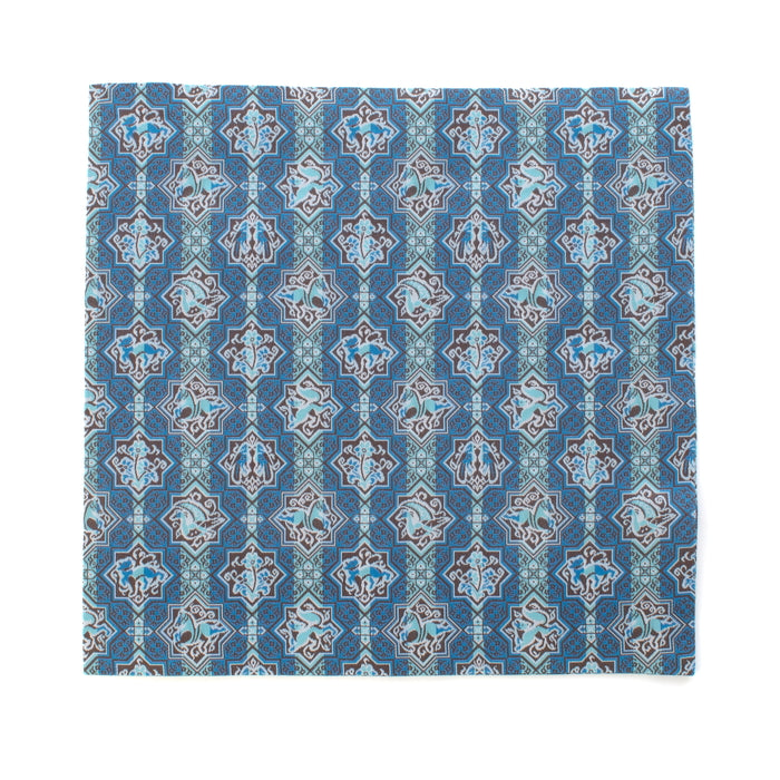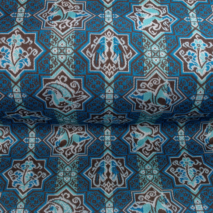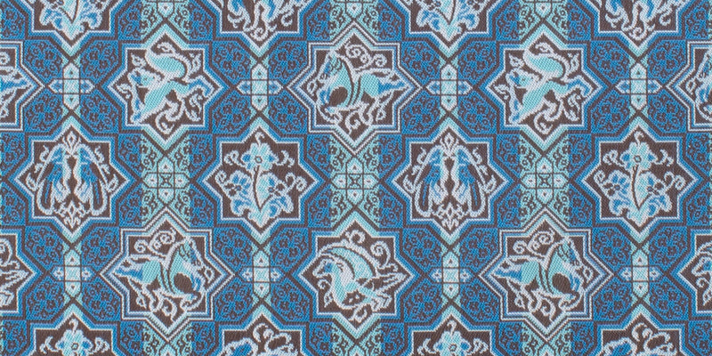 The design of this brocade is modeled after the pictures drawn on the tiles excavated in Turkey, used to decorate the majestic palace of the Seljuk Empire. The tiles, star-shaped and cross-shaped, were drawn, spontaneously and humorously, by the horses, the peacooks, the dogs, together with the vines. We have laid them here in a continuance pattern.