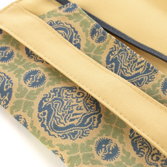There have been too many designs to count drawn in combination of dragon and cloud together because traditionally it is said that "there is a cloud where a dragon leaps and a dragon lies behind a cloud". Among those, the original design of this brocade, depicting the clouds in hexagonal pattern and a vigorous and graceful dragon design in roundel placed in the center, reminds a superior power of creation of the ancient artists. The dignified design was woven into warp-patterned brocade in our weaving technique.