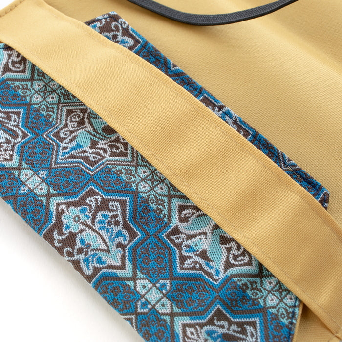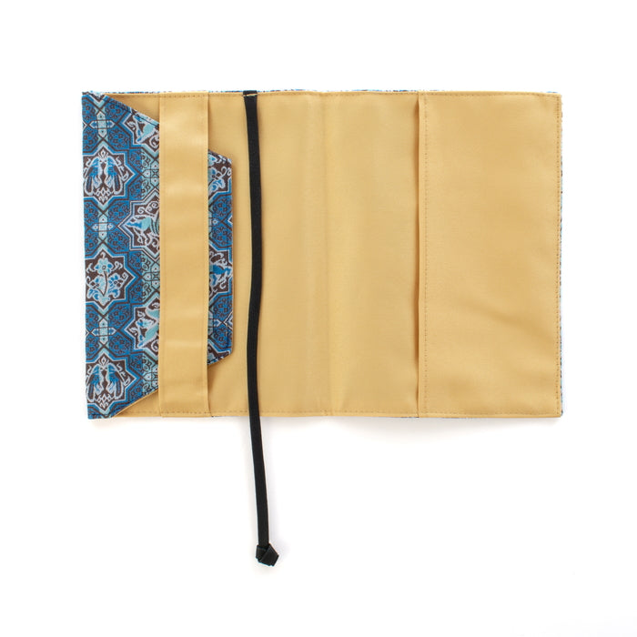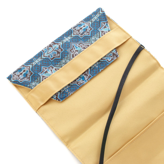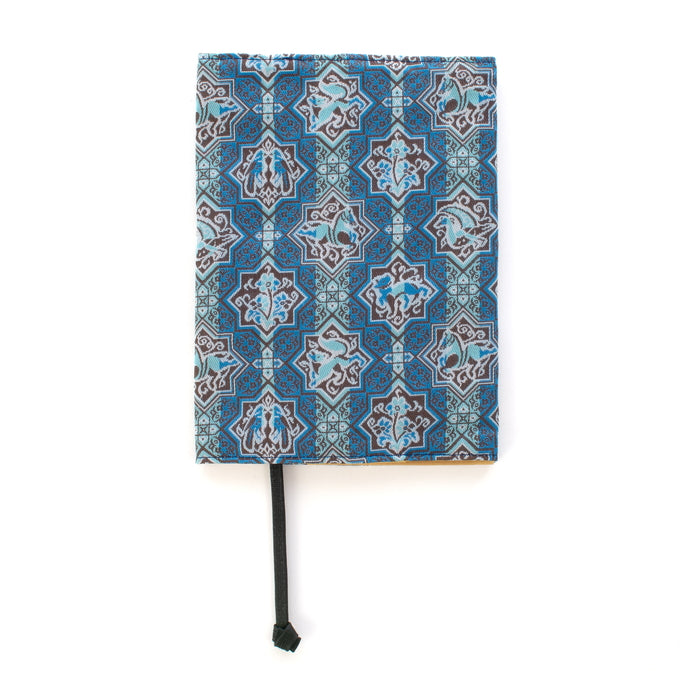 We wove, into a warp-patterned brocade, hte small world of the animals spread endlessly in the stars of the tiles, trying best use of the original colors of the Seljuk tiles such as sacred blue, charming white, and black.