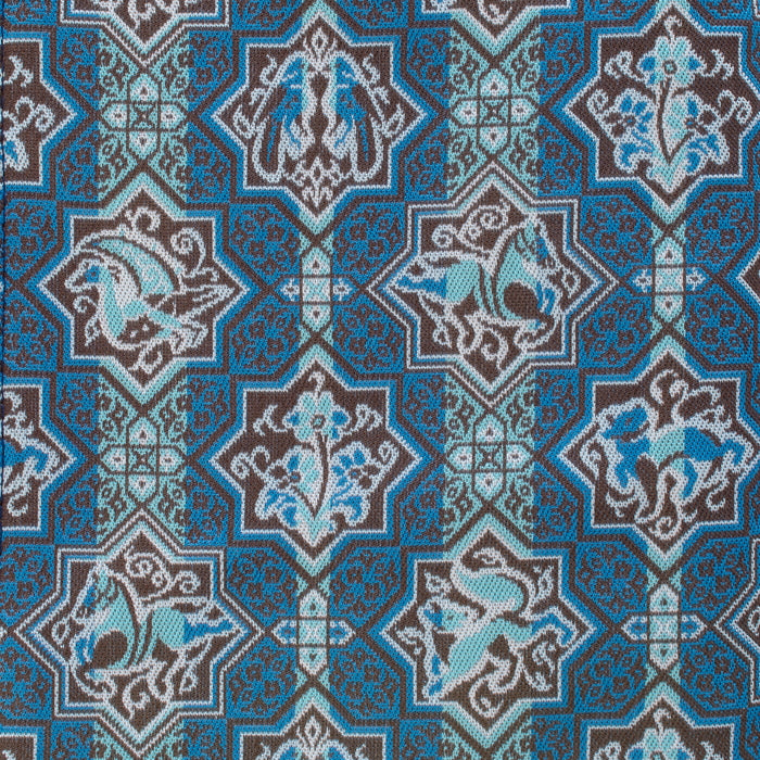 The design of this brocade is modeled after the pictures drawn on the tiles excavated in Turkey, used to decorate the majestic palace of the Seljuk Empire. The tiles, star-shaped and cross-shaped, were drawn, spontaneously and humorously, by the horses, the peacooks, the dogs, together with the vines. We have laid them here in a continuance pattern.