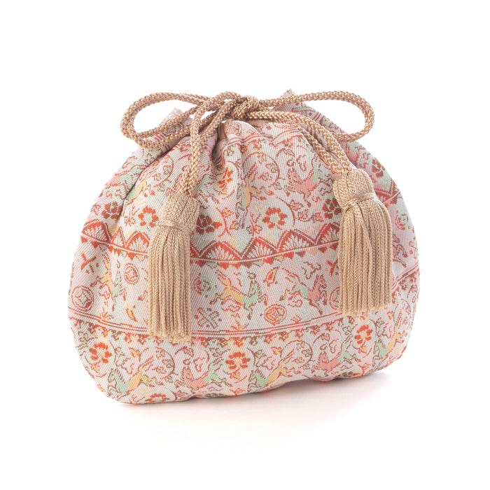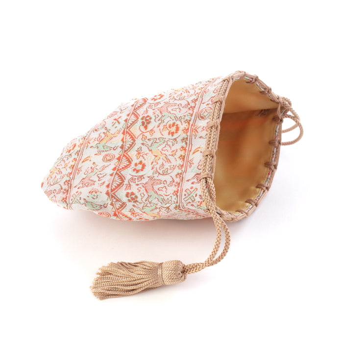 This is a cute, small, rounded drawstring bag. Its convenient size and appearance are very cute, and it is a very cute and versatile item that fits in with any outfit without feeling out of place. We have a wide lineup ranging from traditional patterns of high-quality silk fabrics to chic and calm patterns. Because the mouth opens wide, you can easily find and take out small items, making this drawstring bag extremely easy to use. It has better storage capacity than it looks, and you can use it in a variety of ways, including storing cosmetics as a cosmetic pouch, sweets, and other small items. The 120-year-old traditional craftsmanship of the silk fabric and the cute, unique appearance of the mini drawstring purse make this a playful yet practical product that is highly recommended.