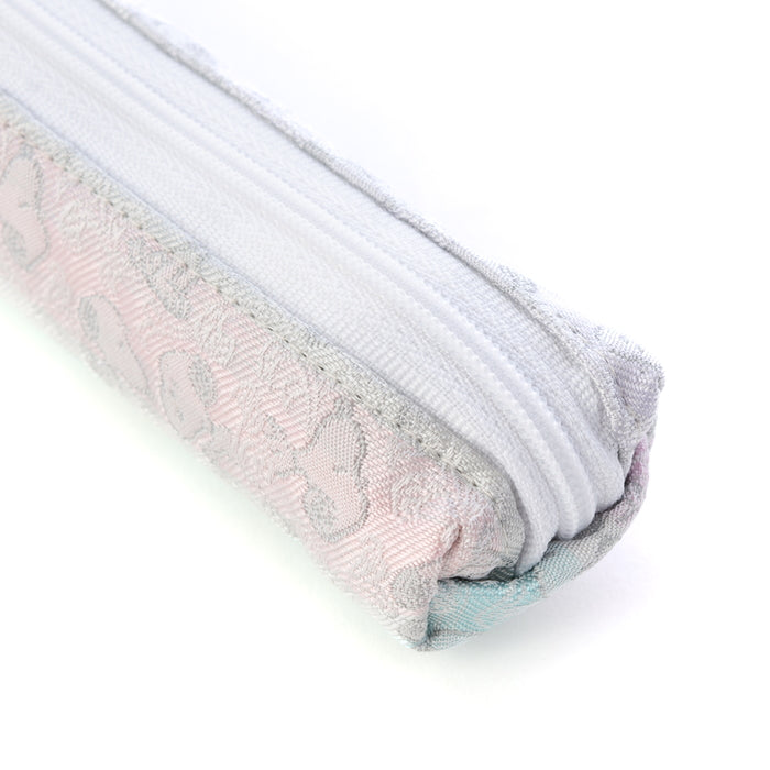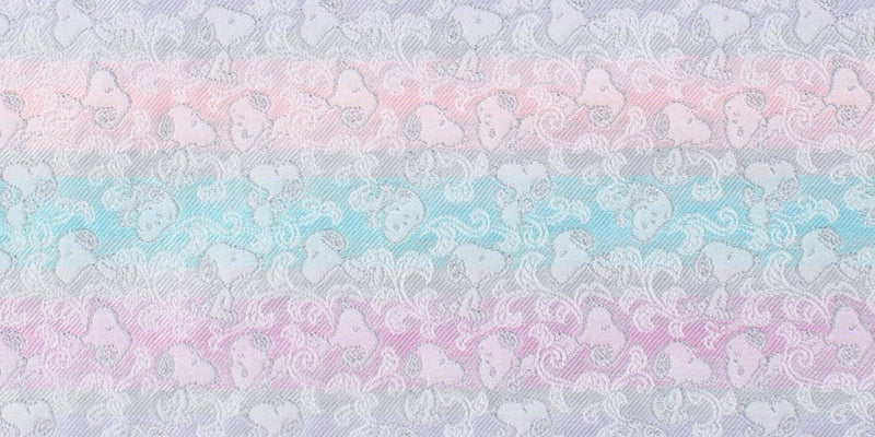 Here, by weaving the outline of the arabesque pattern in a thin yarn to bring out the beauty of its sensitiveness, and in between, Snoopy motif in a thinner yarn so as to look like a "hidden picture" for fun. We have woven the lustrous silk-fabric to bring the shade and shadow effect so that you may feel an amazement and freshness. Here, we made a new textile design of Snoopy.