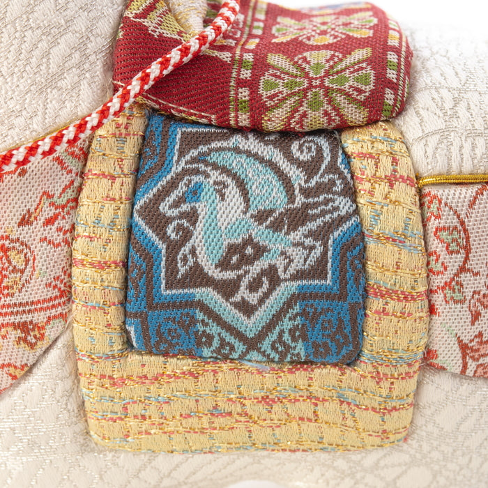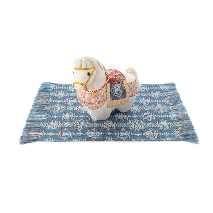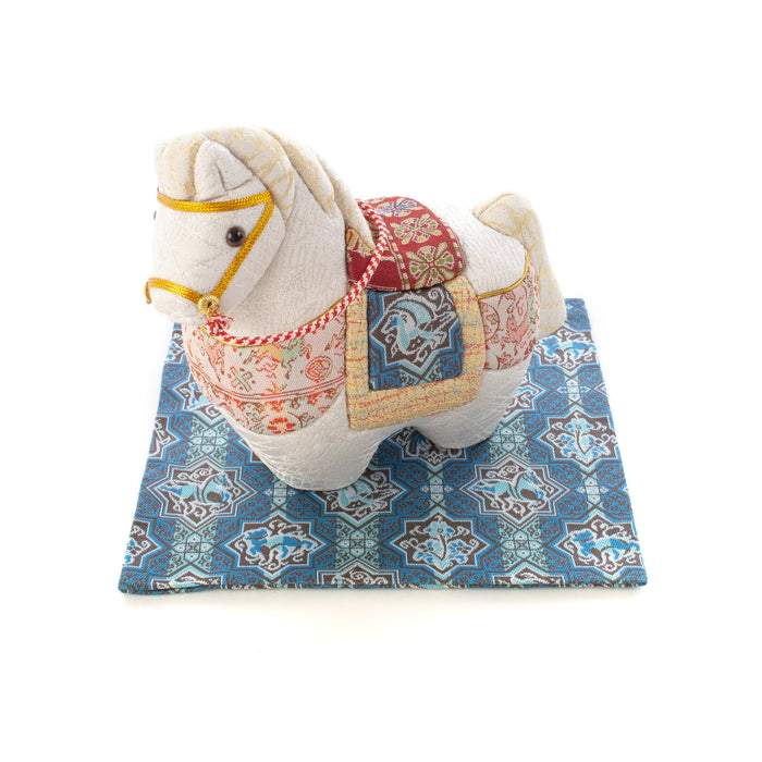 This is a zodiac doll from Tatsumura Art Textiles, with the hope of warding off bad luck and bringing good fortune for the year. It is a popular item that receives many orders every year at Tatsumura Art Textiles. The surface of the zodiac "Horse" wood grain doll features new patterns "Tō-sai Yūba-mon(Galloping Horse Design on the White Porcelain)" and "Shunsei Susuki Mon Nishiki", the saddle is "Serujūku-no-Uma(Seijuk Horse)", "Pazyryk-no Uma" and "Gold Melon", and the mane is "Brocade with Pine Needle Pattern" to create an elegant and auspicious design. As we welcome the New Year, be sure to display this zodiac "Horse" wood grain doll, a symbol of happiness, in your home, office, or other places.