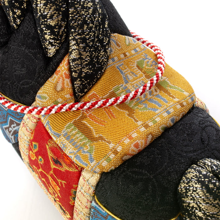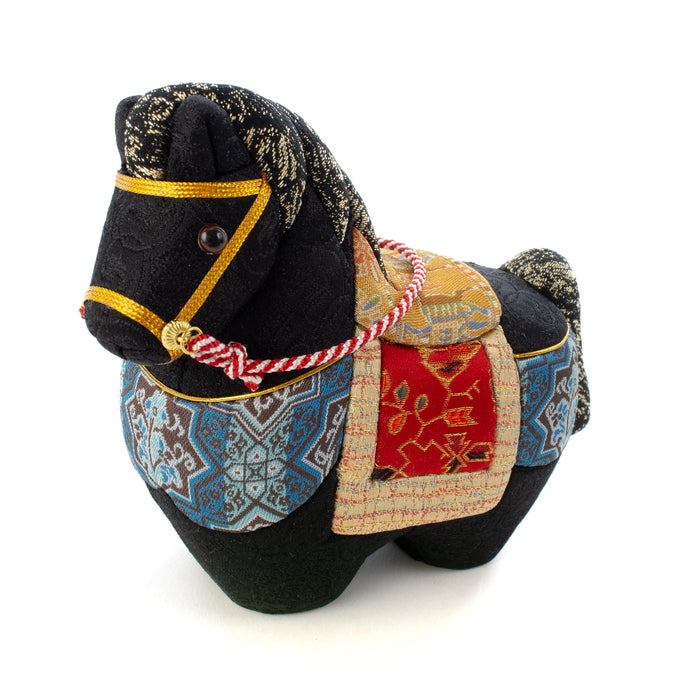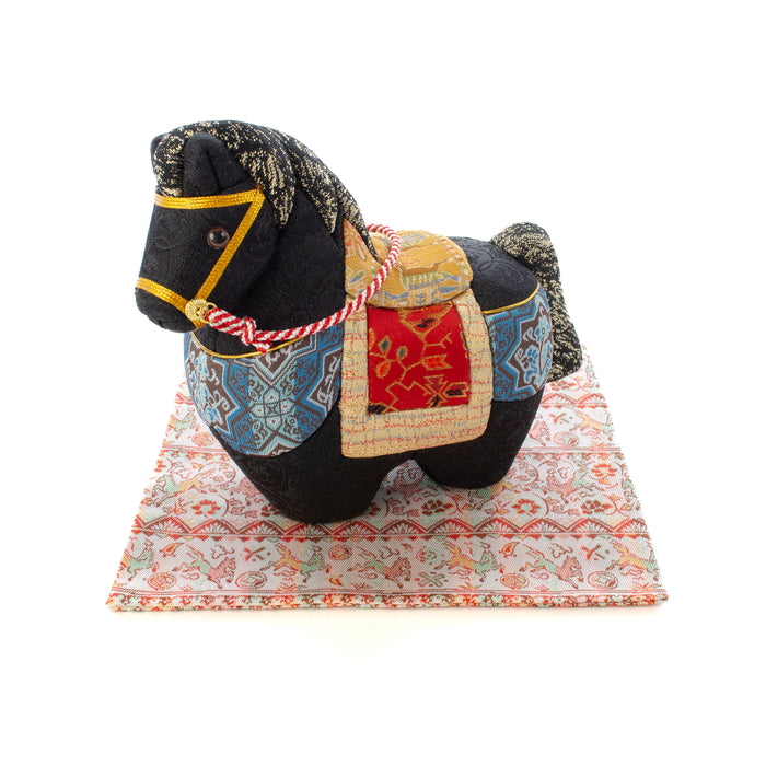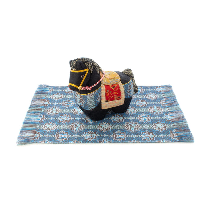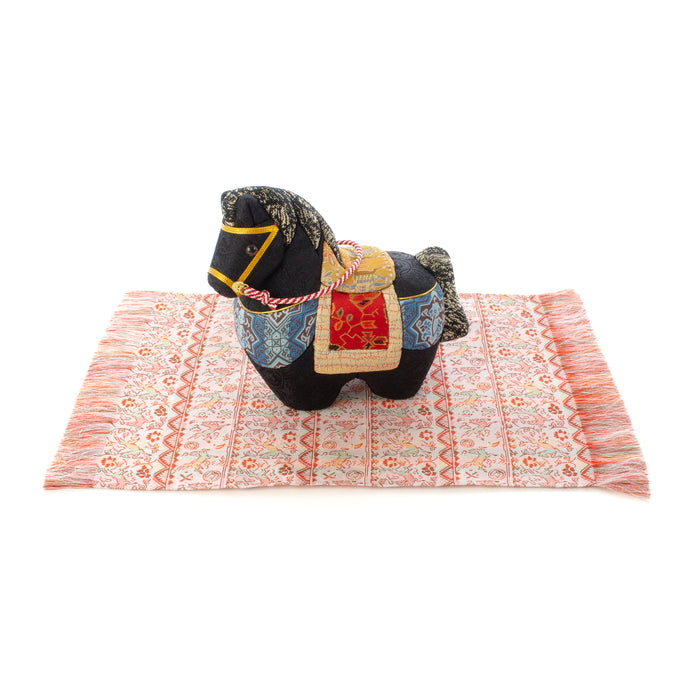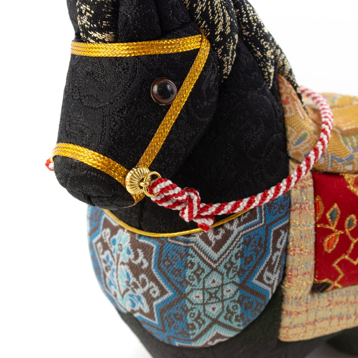 This is a zodiac doll from Tatsumura Art Textiles, with the hope of warding off bad luck and bringing good fortune for the year. It is a popular item that receives many orders every year at Tatsumura Art Textiles. The surface of the zodiac "Horse" wood grain doll features new patterns "Serujūku-no-Uma(Seijuk Horse)" and "Budo Karakusa-mon Nishiki", the saddle is "Pazyryk-no Uma", "Omoide" and "Gold Melon", and the mane is "Kiku Momi" to create an elegant and auspicious design. As we welcome the New Year, be sure to display this zodiac "Horse" wood grain doll, a symbol of happiness, in your home, office, or other places.