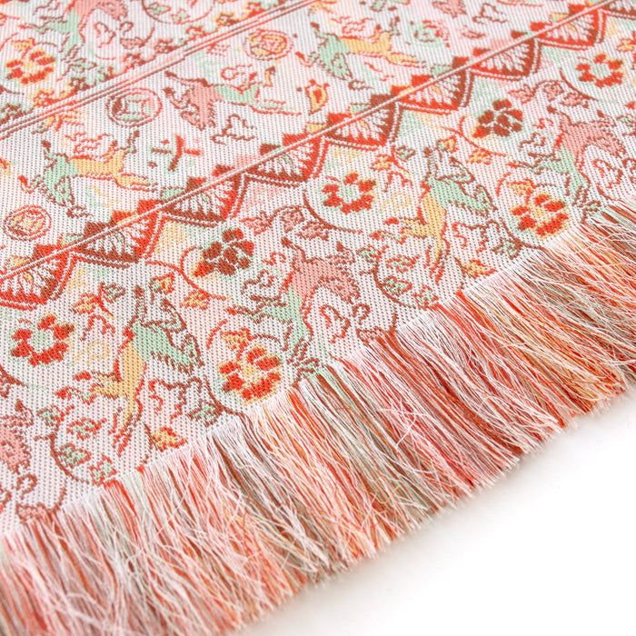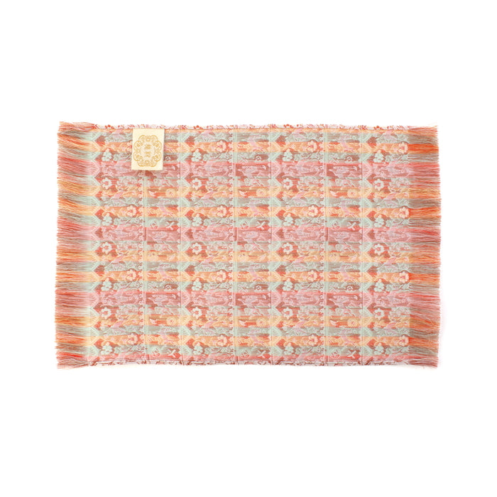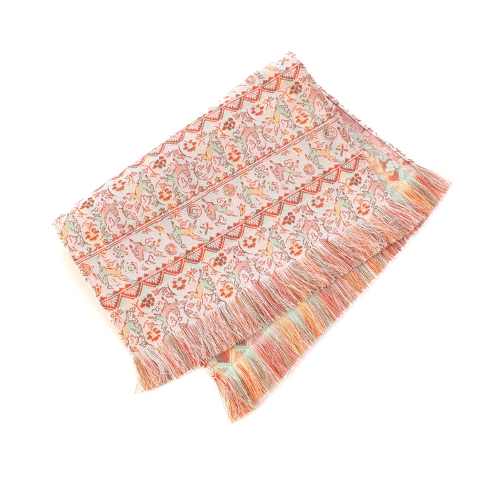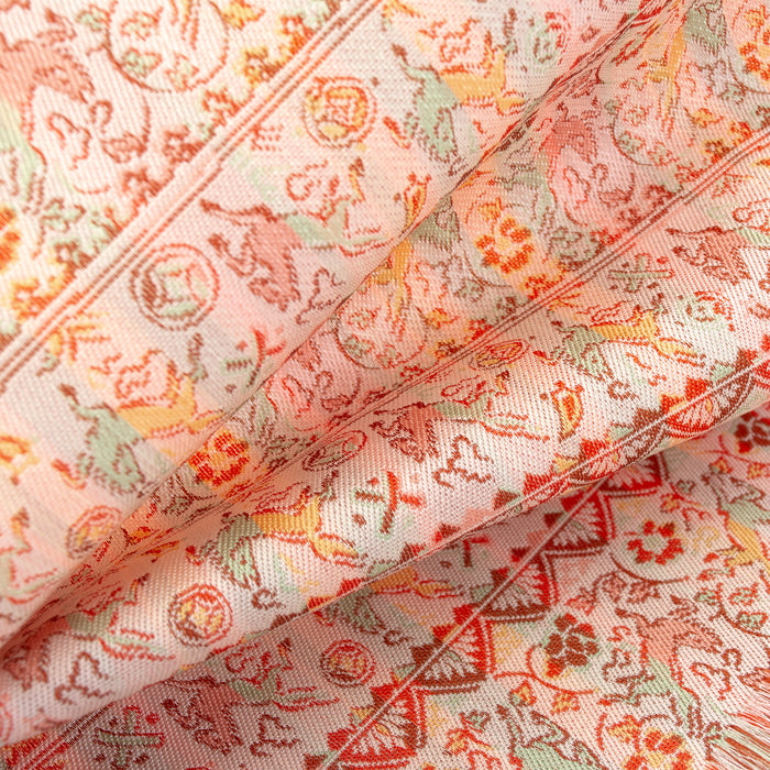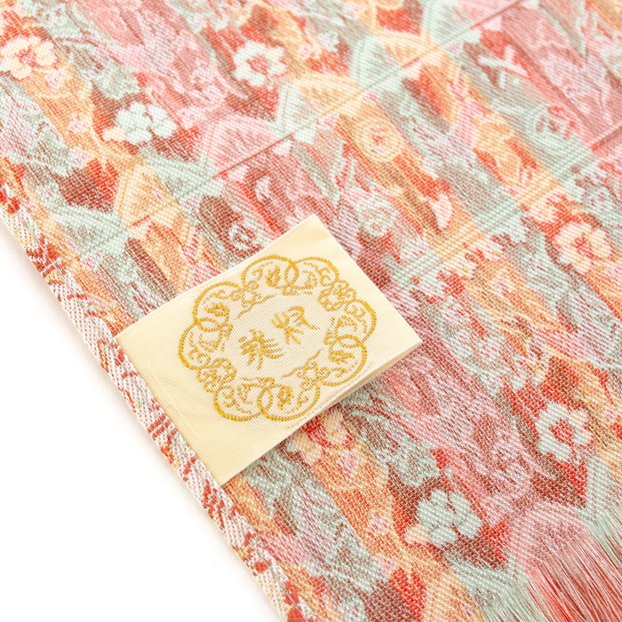 中国陶磁器の一種で白磁に下絵を赤、緑、黄、青、黒の釉薬で描いたものは赤絵と呼ばれ、遠くヨーロッパの陶芸にも大きな影響を与えるほどのものでした。その最盛期で色鮮やかな作品が数多く作られるようになった中国・明時代の作品の中から軽やかに駆ける馬の意匠に範を求め、七宝や丁子、宝巻などの宝尽くしと富貴の象徴として愛された牡丹唐草を組み合わせました。リズミカルに駆け抜ける馬を描く絵付けの伸びやかな筆使いや明時代の赤絵が持つ華やかな趣を経錦の織り技法で表現しました。