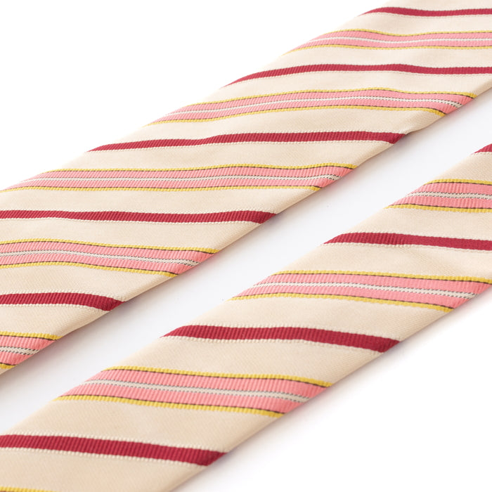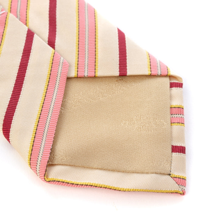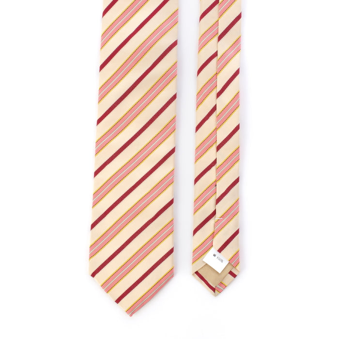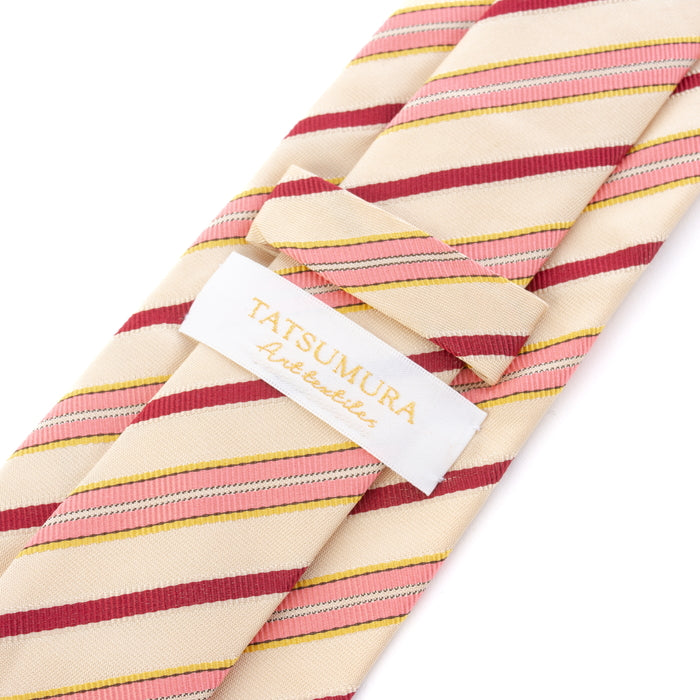名物裂に日野間道と呼ばれる裂がある。名器日野肩衝の仕覆に用いられた為、その名称を裂の名称としたといわれています。本歌は、薄い白茶の地合にえんじ、白、黄、うす紅色の縞を真田風に織り出すため、よろけが出来るが、その風趣がかえって喜ばれました。 本品は、うす地を綾地にかえて本歌の感触を可能の限り写し出したものです。