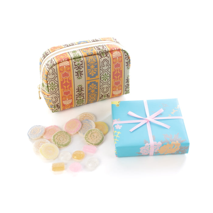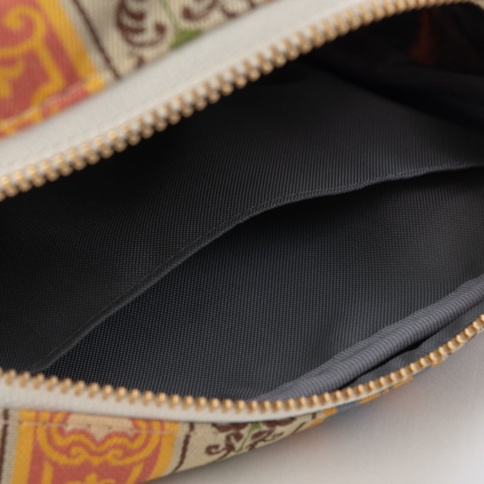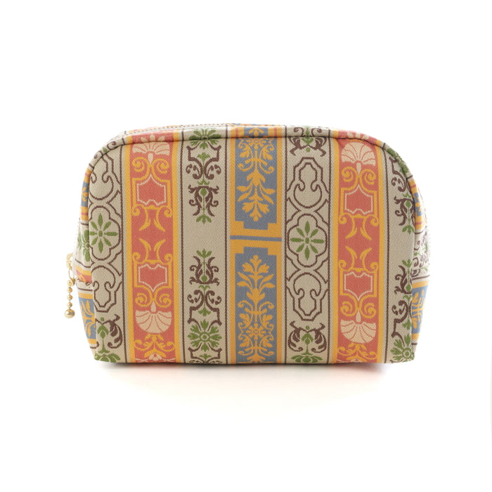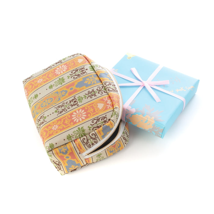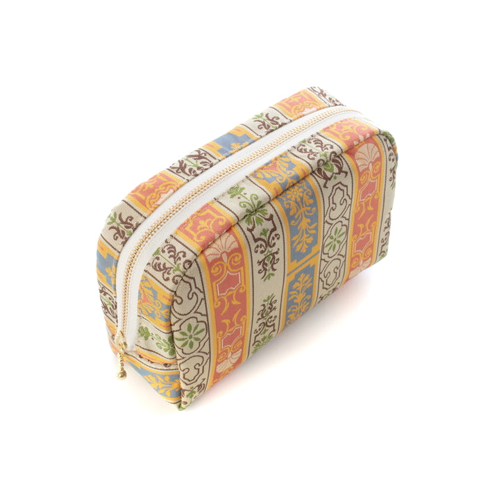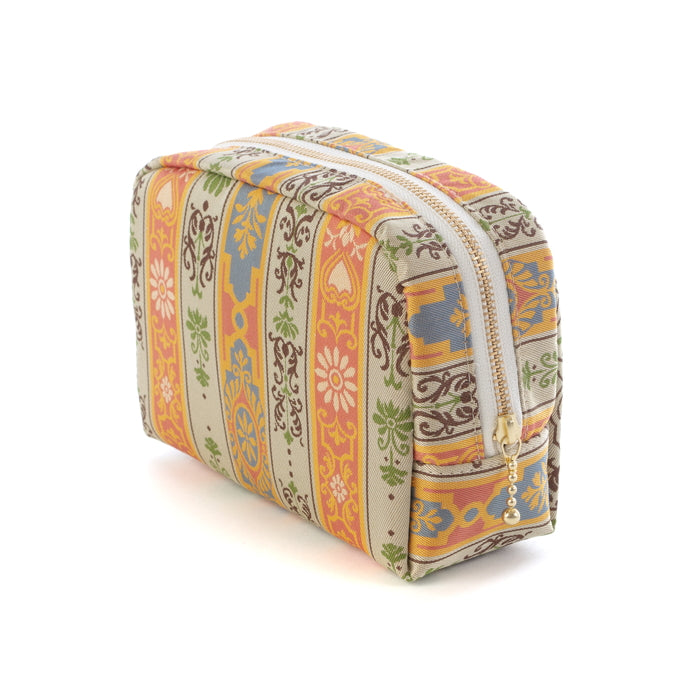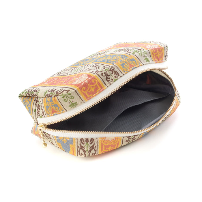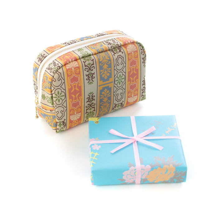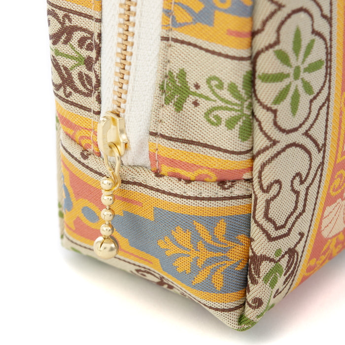 表生地には、優美な意匠が魅力の「ロワール飾花文」をあしらい、格式と華やぎを兼ね備えたBOX型ポーチに仕立てました。YKK製ファスナーも可愛らしい形を採用、裏地には汚れを拭き取りやすい素材を使用するなど、細部にまでこだわった特製仕様となっております。「ロワール飾花文」は、フランス・ロワール河畔の城郭装飾に着想を得た文様で、幾何学的な枠の中に左右対称の植物が美しく配されています。その調和のとれた優雅な意匠は、人と人とのご縁や、穏やかな繁栄への願いを感じさせます。