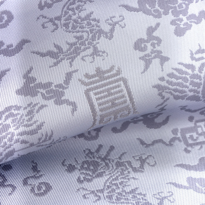 本歌にある鶴の姿を百鳥の王といわれる鳳凰に変え、よりいっそう豊かな人生が末永く続きますよう願いを込め、五代龍村平藏オリジナルの意匠として制作しました。この意匠の特徴である「寿」の文字には金銀糸を織り込み、本歌の持つ上品な光沢感と厳かな趣まで映し込んだ経錦です。