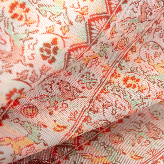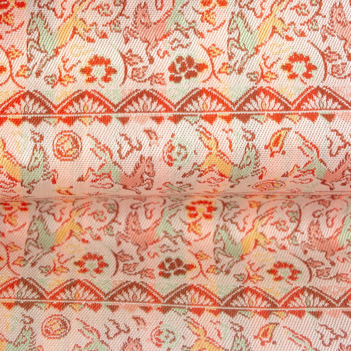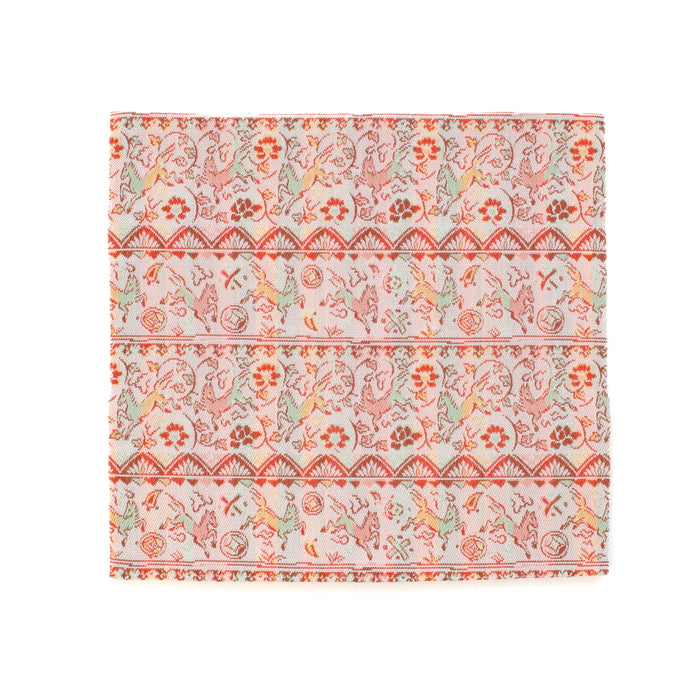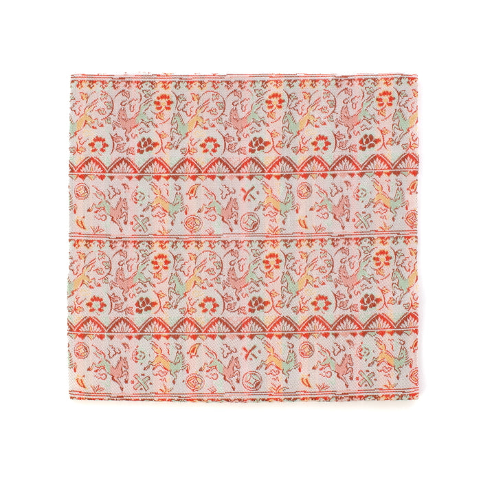 中国陶磁器の一種で白磁に下絵を赤、緑、黄、青、黒の釉薬で描いたものは赤絵と呼ばれ、遠くヨーロッパの陶芸にも大きな影響を与えるほどのものでした。その最盛期で色鮮やかな作品が数多く作られるようになった中国・明時代の作品の中から軽やかに駆ける馬の意匠に範を求め、七宝や丁子、宝巻などの宝尽くしと富貴の象徴として愛された牡丹唐草を組み合わせました。リズミカルに駆け抜ける馬を描く絵付けの伸びやかな筆使いや明時代の赤絵が持つ華やかな趣を経錦の織り技法で表現しました。