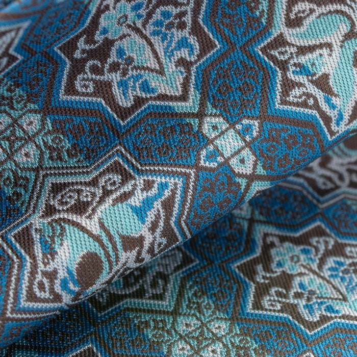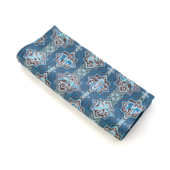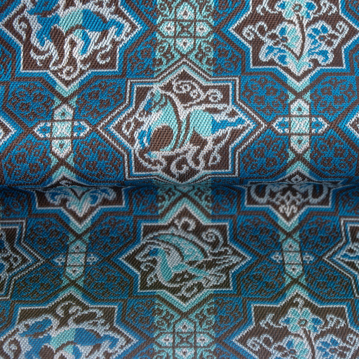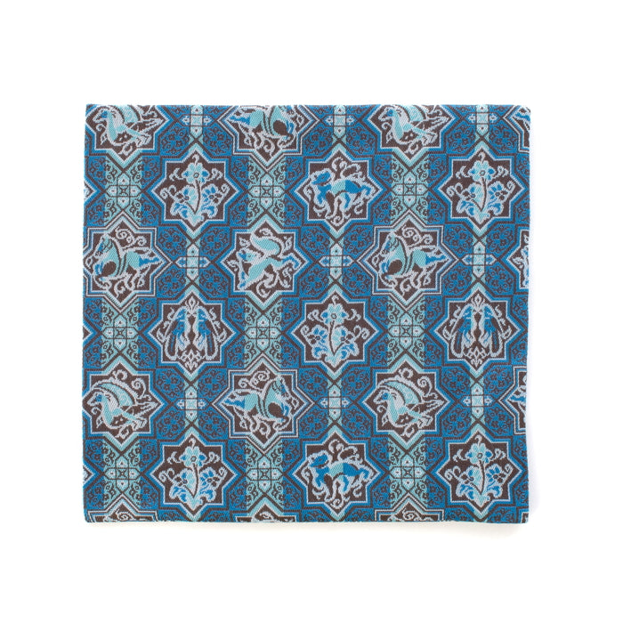 無限に広がるタイルの星々の中、色褪せることなく続く動物たちの小さな世界を、聖なる青と陶磁の艶やかな白、黒のコントラストを活かし経錦として織り成しました。