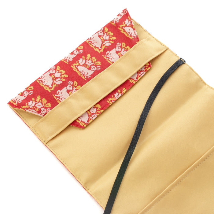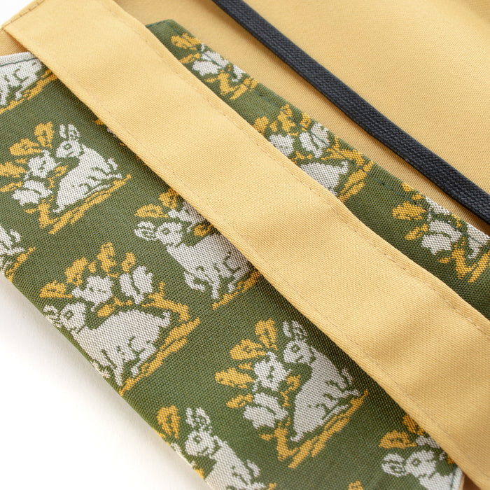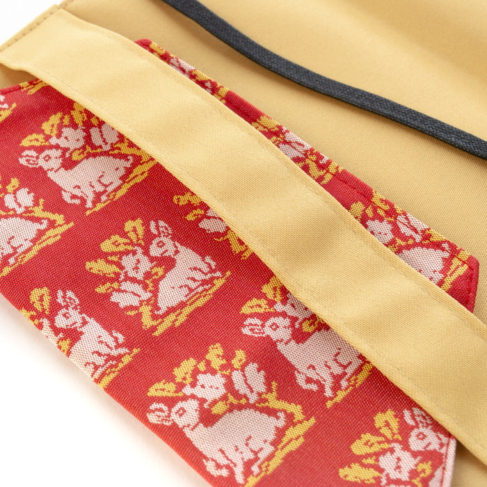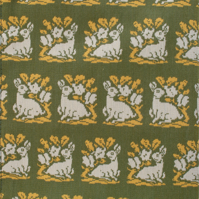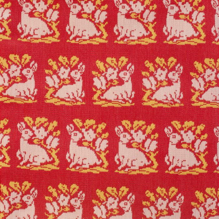 桃山時代の京洛の豪商であり、茶人でもあった角倉了以の名称に由来する「名物角倉金襴」は、一茎の花樹とそれを振り返る愛らしい兎の姿態、その足もとに土坡という 〝作り土〟の洗練された意匠であります。