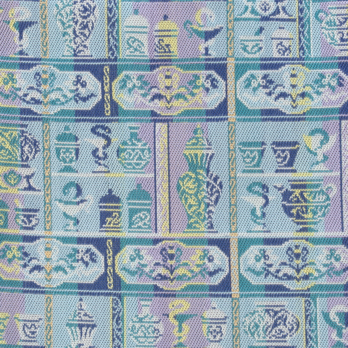 この経錦は東ヨーロッパの歴史ある薬局の薬棚に範を求め、薬学と縁深い蛇を組み合わせました。様々な陶器の薬壷が並ぶ美しい棚をノスタルジー溢れる趣そのままにデザインしたものです。長い歴史が今も息づき、ハーブが心地よく香る空間へ一歩足を踏み入れたときの高揚感を色鮮やかに表現しました。