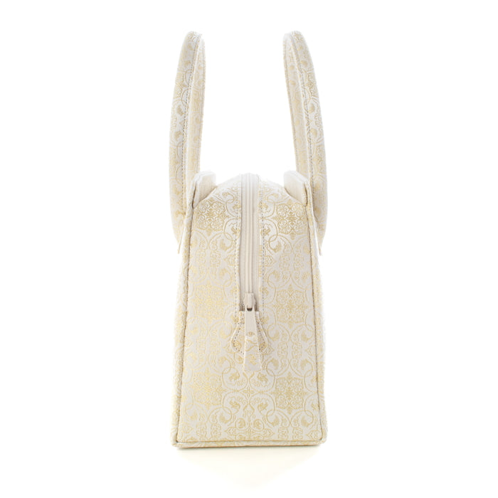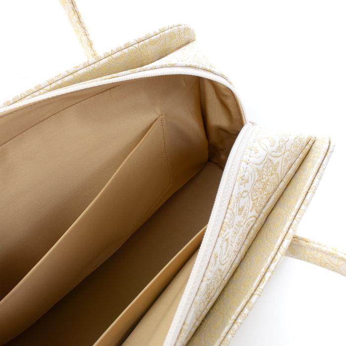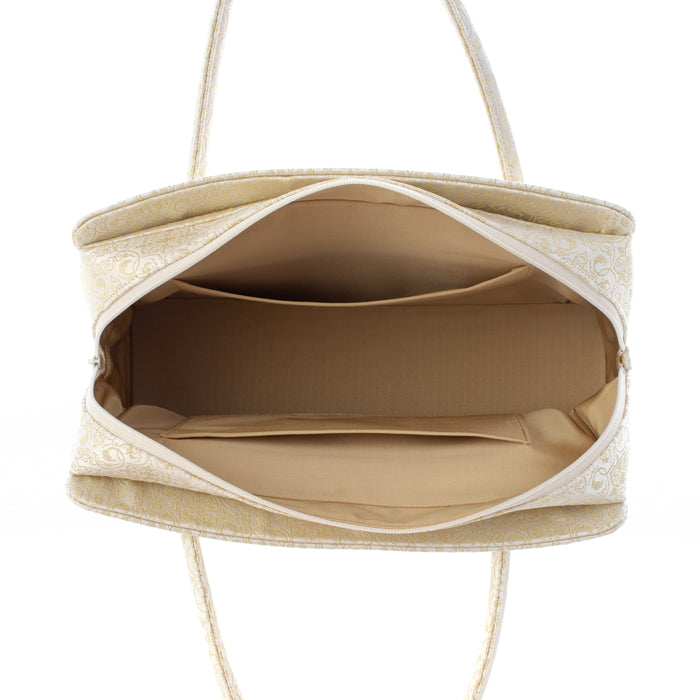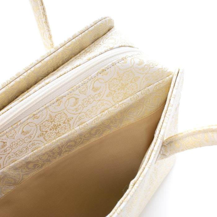 全面に龍村裂を使用し、上品で華やかな色合いのバッグはワンランク上の装いを演出します。開口部が広いので荷物の出し入れがしやすく、ファスナーで完全に閉まりますので、持ち姿も美しく見せます。マチもしっかりとありますので、金封袋、化粧ポーチ、携帯電話、長札入、ハンカチなどの必需品も、しっかり収納できます。