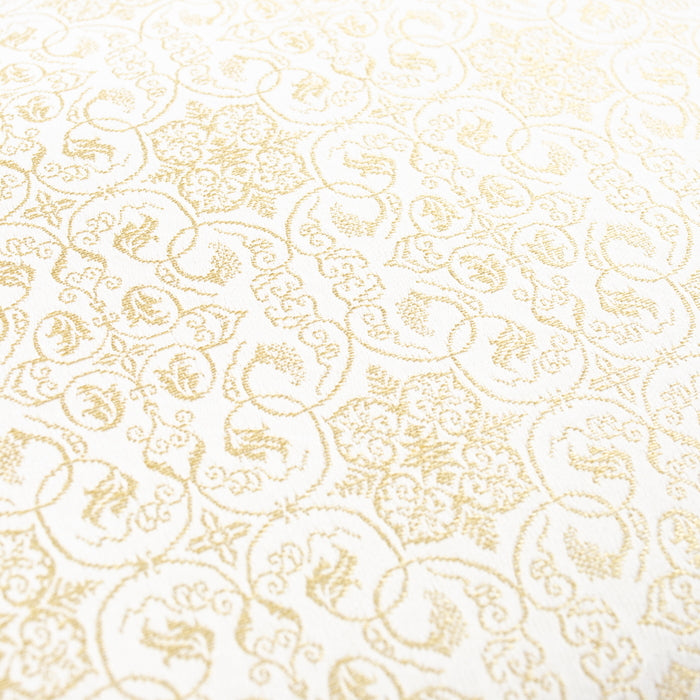 文様は、四方に尖頭を出す複合四弁の唐花を中央におき、その周囲に八花形に蔓をめぐらし、蔓の先には葉、果実、捲き蔓をおのおのシンメトリックに配しています。蔓はまことに見事な孤線を描き、複雑な構造ながら美しくまとまって、葡萄唐草の意匠に対する高度な図案化がうかがわれます。正倉院宝庫に数多く在る葡萄唐草文様のうちで、最も優美な感を与える作品は、この錦でありましょう。