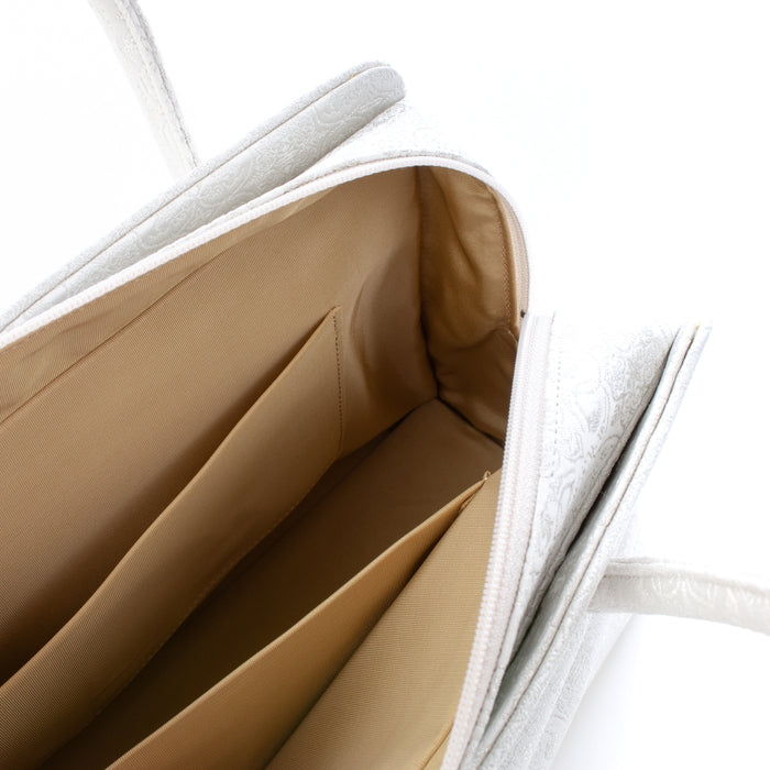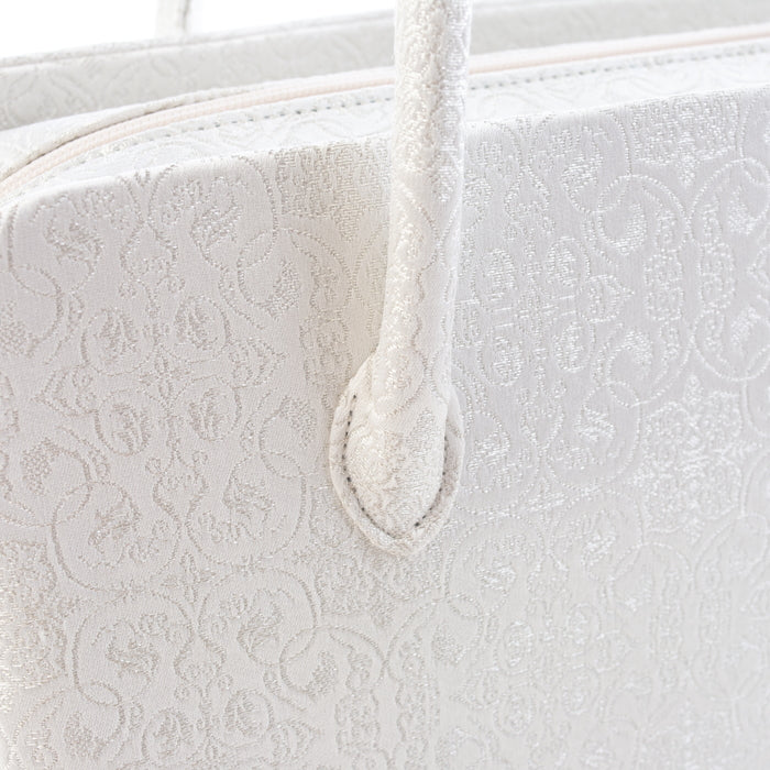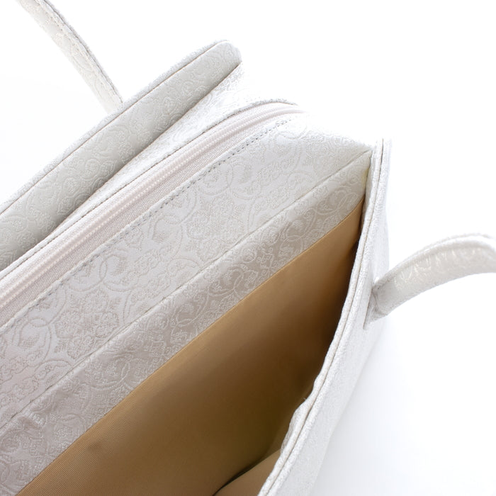 全面に龍村裂を使用し、上品で華やかな色合いのバッグはワンランク上の装いを演出します。開口部が広いので荷物の出し入れがしやすく、ファスナーで完全に閉まりますので、持ち姿も美しく見せます。マチもしっかりとありますので、金封袋、化粧ポーチ、携帯電話、長札入、ハンカチなどの必需品も、しっかり収納できます。