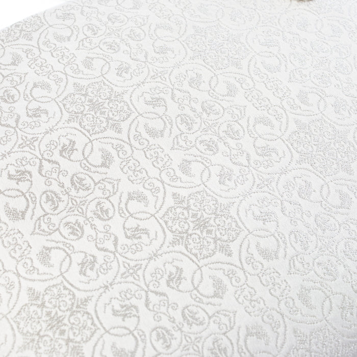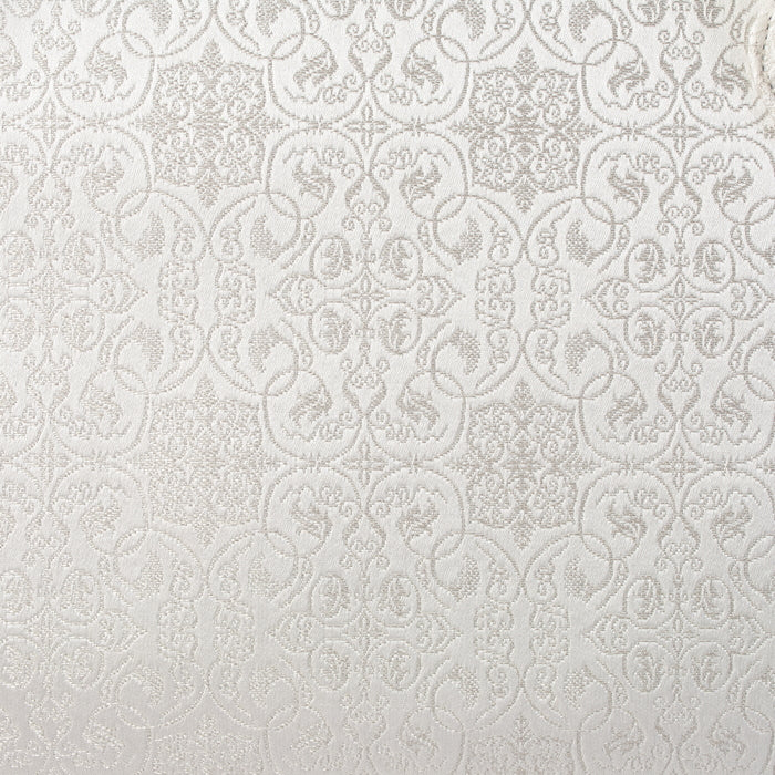 文様は、四方に尖頭を出す複合四弁の唐花を中央におき、その周囲に八花形に蔓をめぐらし、蔓の先には葉、果実、捲き蔓をおのおのシンメトリックに配しています。蔓はまことに見事な孤線を描き、複雑な構造ながら美しくまとまって、葡萄唐草の意匠に対する高度な図案化がうかがわれます。正倉院宝庫に数多く在る葡萄唐草文様のうちで、最も優美な感を与える作品は、この錦でありましょう。