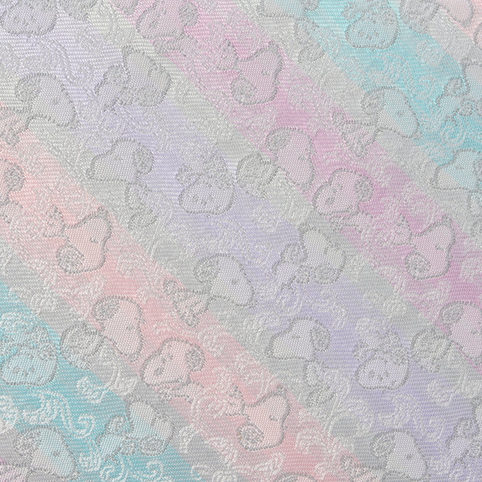 日本の伝統的な文様の中にスヌーピーが見え隠れするような動きのあるデザインに仕上がっており、華やかながら落ち着いた色味と、絹ならではの光沢とやさしい風合いが特徴です。