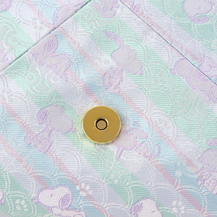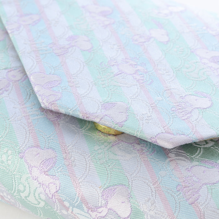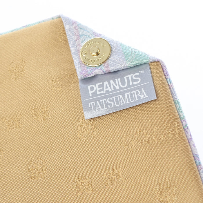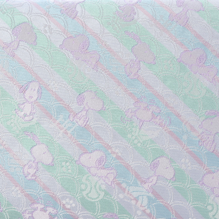 日本の伝統的な文様の中にスヌーピーが見え隠れするような動きのあるデザインに仕上がっており、華やかながら落ち着いた色味と、絹ならではの光沢とやさしい風合いが特徴です。