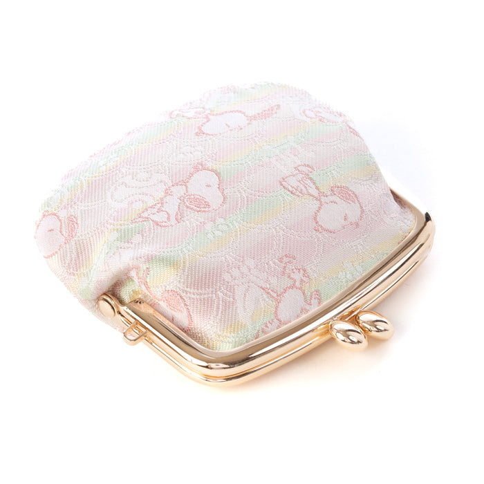 日本の伝統的な文様の中にスヌーピーが見え隠れするような動きのあるデザインに仕上がっており、華やかながら落ち着いた色味と、絹ならではの光沢とやさしい風合いが特徴です。